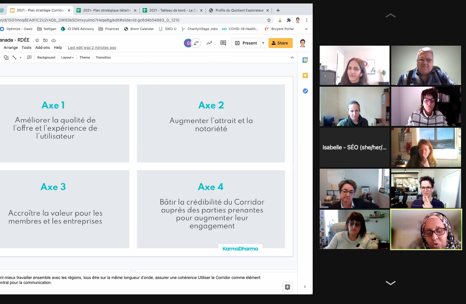 OTTAWA – le 17 mars 2021 – Un sous-comité conjoint du Groupe de travail en enjeux économiques (GTEÉ) touristique et du Groupe de travail en enjeux communications (GTEC) de RDÉE Canada – formé d’agents touristiques et des agents de communication du pays – s’est rencontré virtuellement mardi après-midi pour faire évoluer son projet de revampe et de promotion du Corridor culturel, patrimonial et touristique national. Les agents ont discuté avec des consultants de la firme KarmaDharma du nouveau Plan stratégique pour le développement du Corridor et du positionnement désiré. On vise améliorer la qualité de l’offre et l’expérience de l’utilisateur, augmenter l’attrait et la notoriété du Corridor, accroître la valeur pour les membres (entreprises et organismes) et bâtir la crédibilité du Corridor auprès des parties prenantes pour augmenter leur engagement. Lors d’une prochaine rencontre, on discutera du plan de communication. Raymond J. Arsenault, agent de communication de RDÉE Île-du-Prince-Édouard (photo droite supérieur) a participé à la rencontre avec 13 autres personnes.