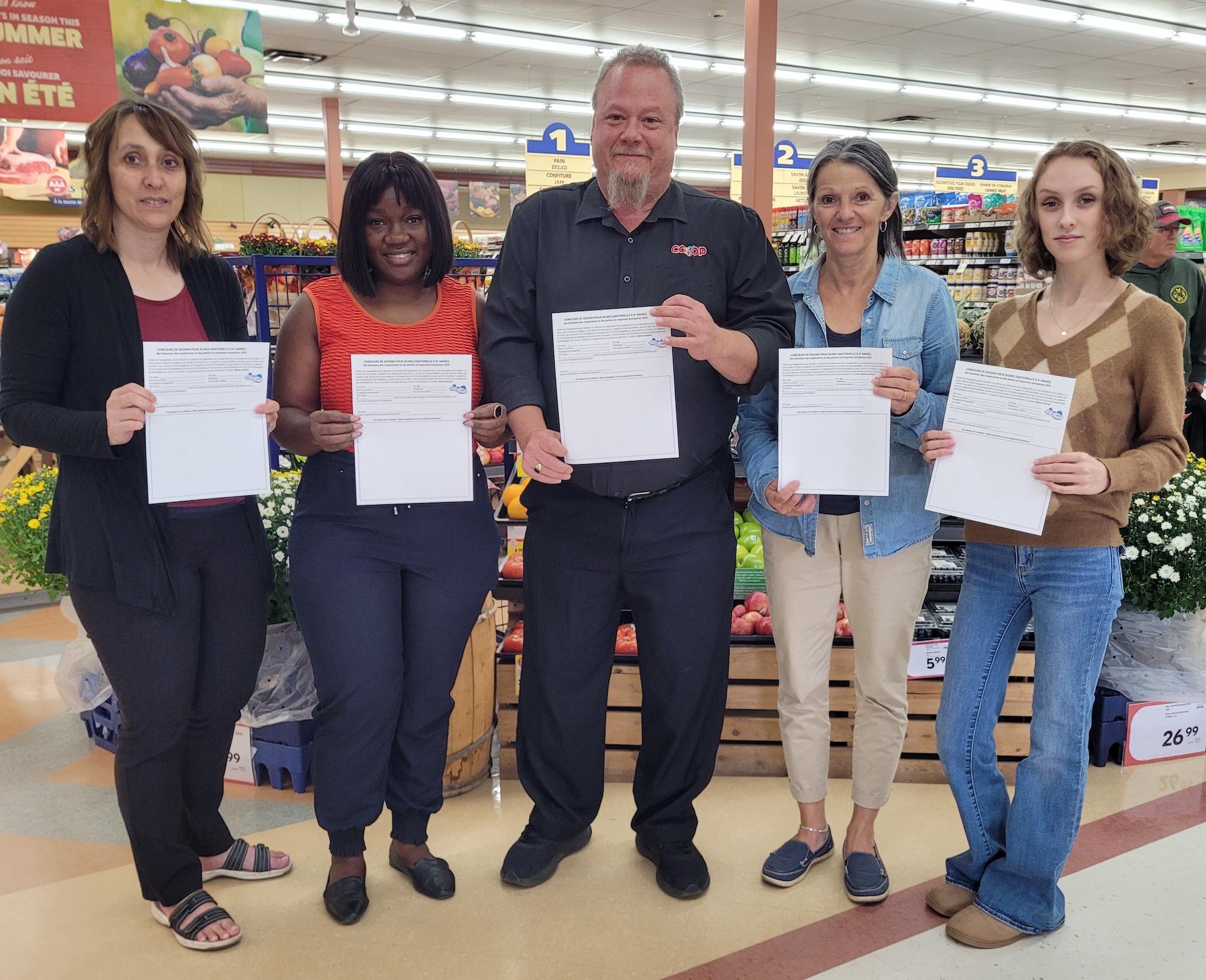 PHOTO : Les enfants de la maternelle à la 6e année pourront encore participer au concours de dessin sur le thème « Mon entreprise ou ma coopérative favorite » au début octobre pour la chance de gagner un beau tube gonflable de rivières, des appareils électroniques ou autres prix. Ce concours est organisé à l’occasion des Semaines des coopératives et des petites et moyennes entreprises 2025 par, de la gauche, Diane McInnis de la Caisse populaire Provincial (succursale Évangéline), Marthe Ngombi du Centre d’action rural de Wellington, Chris O’Brien de la Coopérative de Wellington, Annette Richard du Conseil scolaire-communautaire Évangéline et Alecia Arsenault de la Chambre de commerce acadienne et francophone de l’ÎPÉ.