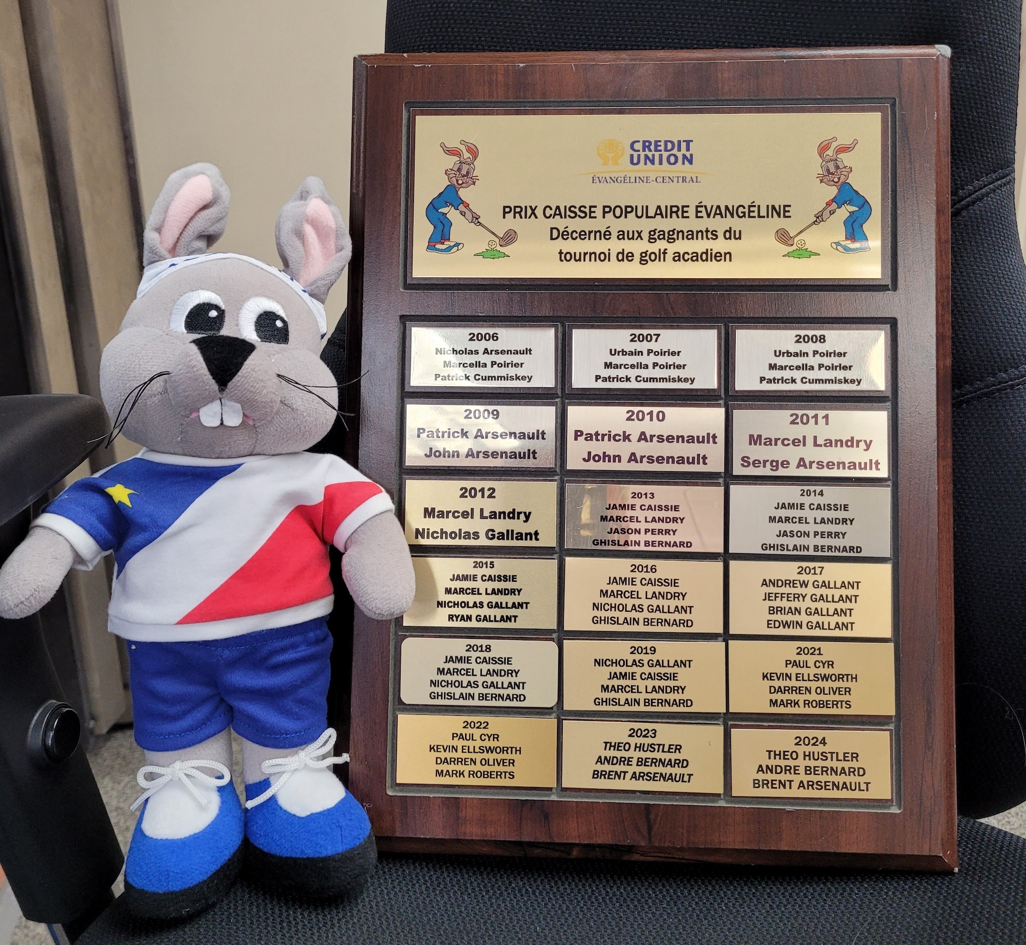 La plaque originale avait été commanditée par l’ancienne Caisse populaire Évangéline, qui est ensuite devenue la Caisse populaire Évangéline-Central, qui s’est finalement amalgamée avec d’autres caisses de l’Île pour devenir la Caisse populaire Provincial. Cette nouvelle version de l’entité financière a accepté d’acheter la nouvelle plaque de remplacement, en plus d’être commanditaire majeur du tournoi 2025 (1 000 $), d’y entrer une équipe, d’y amener sa voiture, d’animer un jeu et d’offrir des petits cadeaux aux quelques 105 participants.
