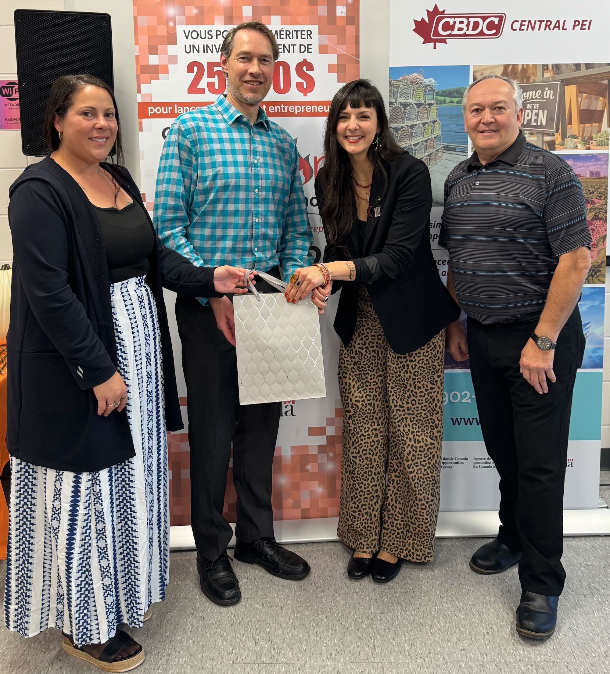 PHOTO SUPÉRIEURE : Les organisateurs et commanditaires du Midi des entrepreneurs et coopérateurs 2025 remercient la conférencière de l’évènement, Hélène Lebon (deuxième de la droite). On voit Mme Lebon qui accepte son cadeau de Janine Arsenault, porte-parole de la CCAFLIPE, Claus Schmidt, directeur général de la CBDC Central PEI, et Robert Maddix, gestionnaire en entrepreneuriat de RDÉE ÎPÉ responsable du projet Solution Repreneuriat.