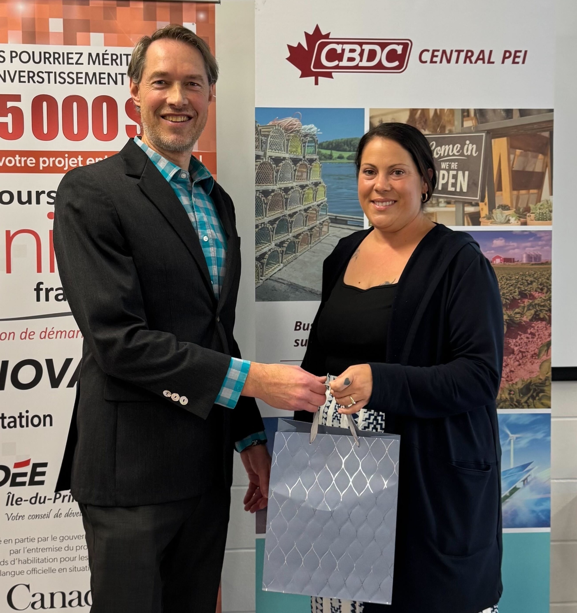 PHOTO SUPÉRIEURE : Janine Arsenault, porte-parole de la Chambre de commerce acadienne et francophone de l’ÎPÉ, remercie Claus Schmidt, directeur général de la CBDC Central PEI, pour sa commandite annuelle du Midi des entrepreneurs et coopérateurs.