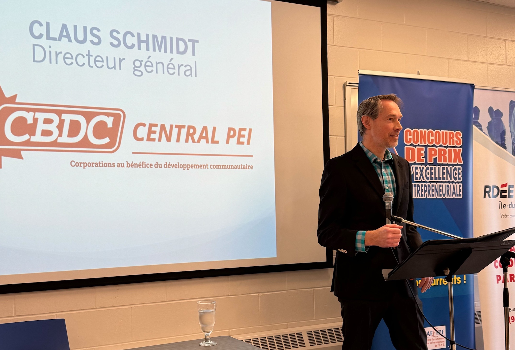 Ensuite, la première personne invitée à prendre la parole était Claus Schmidt, directeur général de la CBDC Central PEI. À son tour, il a mentionné que son organisme était bien content de revenir comme commanditaire du Midi. Il a ensuite parlé des divers services d’appui entrepreneurial, incluant des conseils et des prêts, qu’offre son organisme.