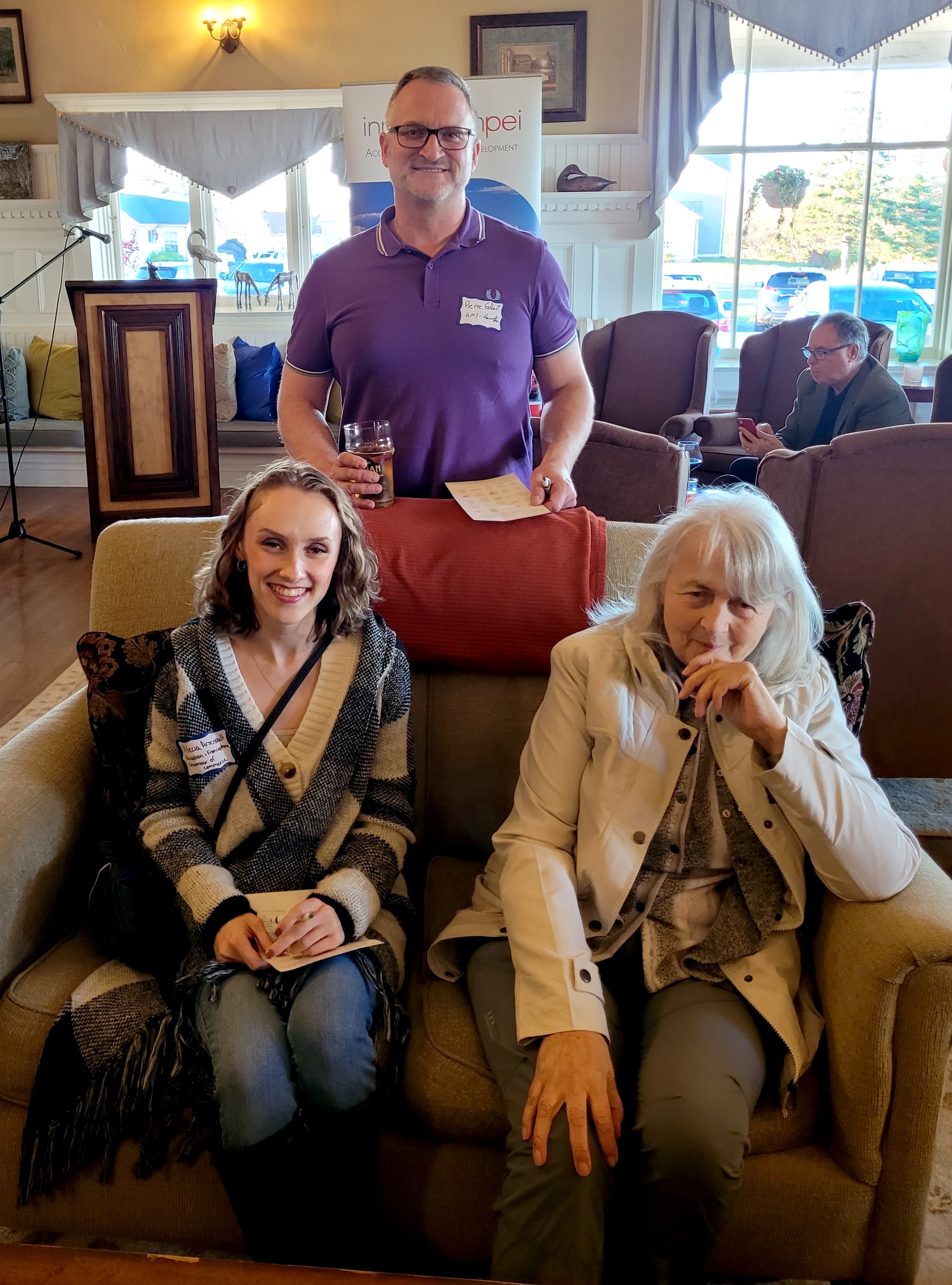 PHOTO 2 : Alecia Arsenault, coordonnatrice d’activités de la CCAFLIPE, a fièrement accueilli deux membres de la Chambre, soit Pierre Gallant de HMS Office Solutions, et Léona Arsenault de PhoArts Visual Images, à la réception de réseautage Mega Mixer 2025. Léona a été l’heureuse gagnante d’un tirage pour une carte-cadeau de 100 $ du Murphy Hospitality Group.