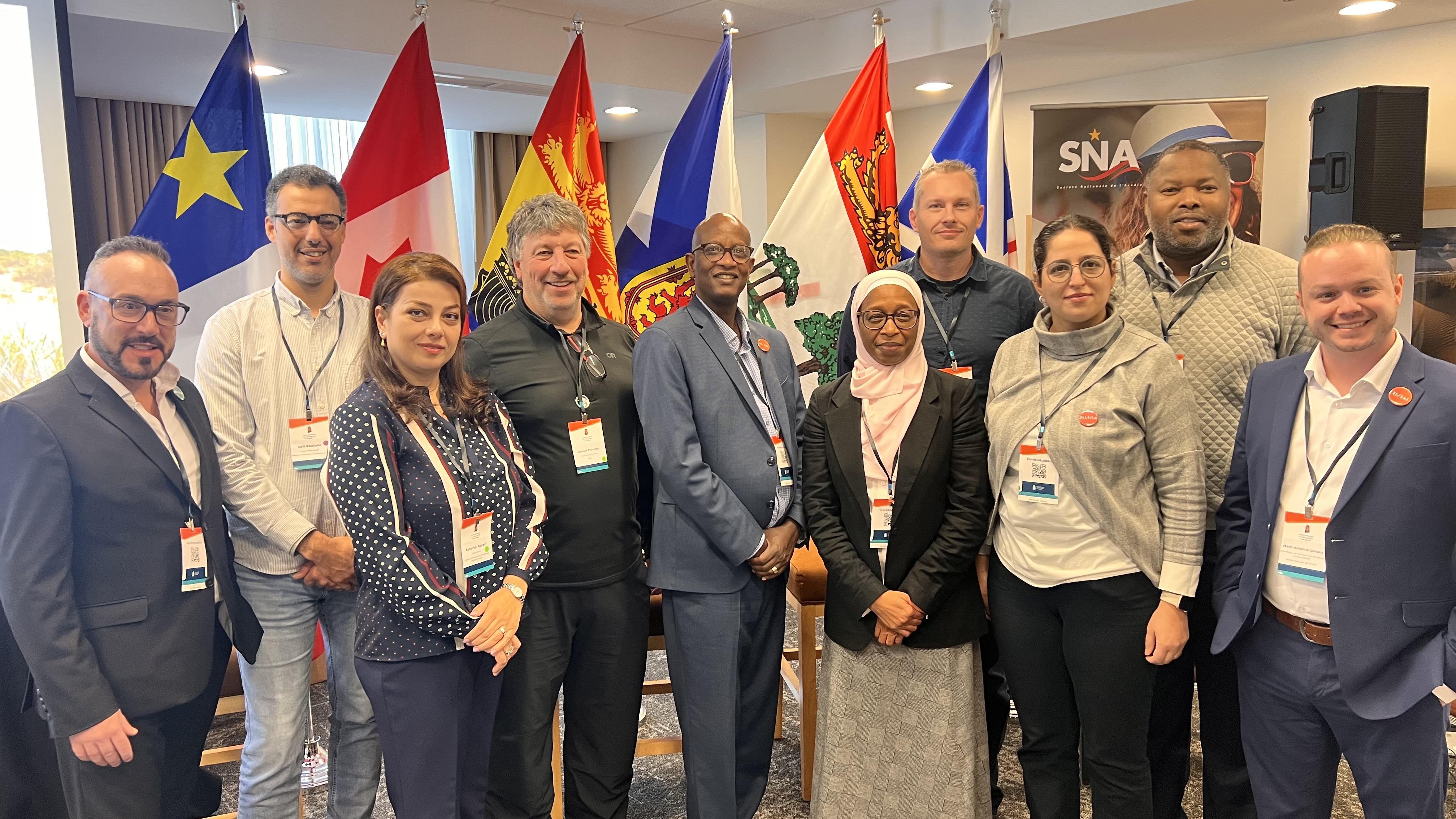 PHOTO 1 : Le gestionnaire en employabilité de RDÉE ÎPÉ, Florian Enjalbal, deuxième rangée, deuxième de la droite, était parmi les partenaires du 8e Colloque sur l’immigration francophone en atlantique. On y trouvait également des représentants du RDÉE Nouveau-Brunswick, du Conseil de développement économique de la Nouvelle-Écosse, de la Société nationale de l’Acadie, le Réseau en immigration francophone de l’ÎPÉ et le Fédération acadienne de la Nouvelle-Écosse.