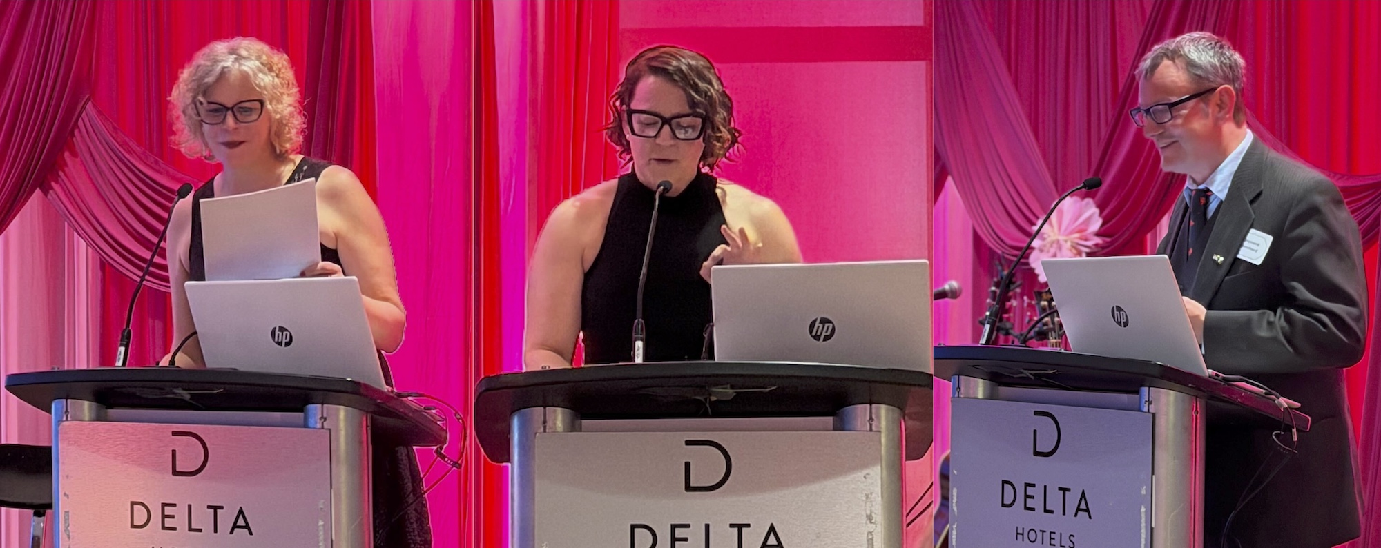 PHOTO 3 : Parmi ceux et celles qui ont adressé la parole pendant la soirée du Gala : Jacinthe Lemire, chargée de projet à l’Île-du-Prince-Édouard et animatrice du Gala ; Marie-Ève Michon, directrice de RDÉE Nouveau-Brunswick, qui gère le programme canadien SR; et Stéphane Blanchard, directeur général de RDÉE Île-du-Prince-Édouard, l’organisme qui agissait d’hôte pour SR à l’Île.