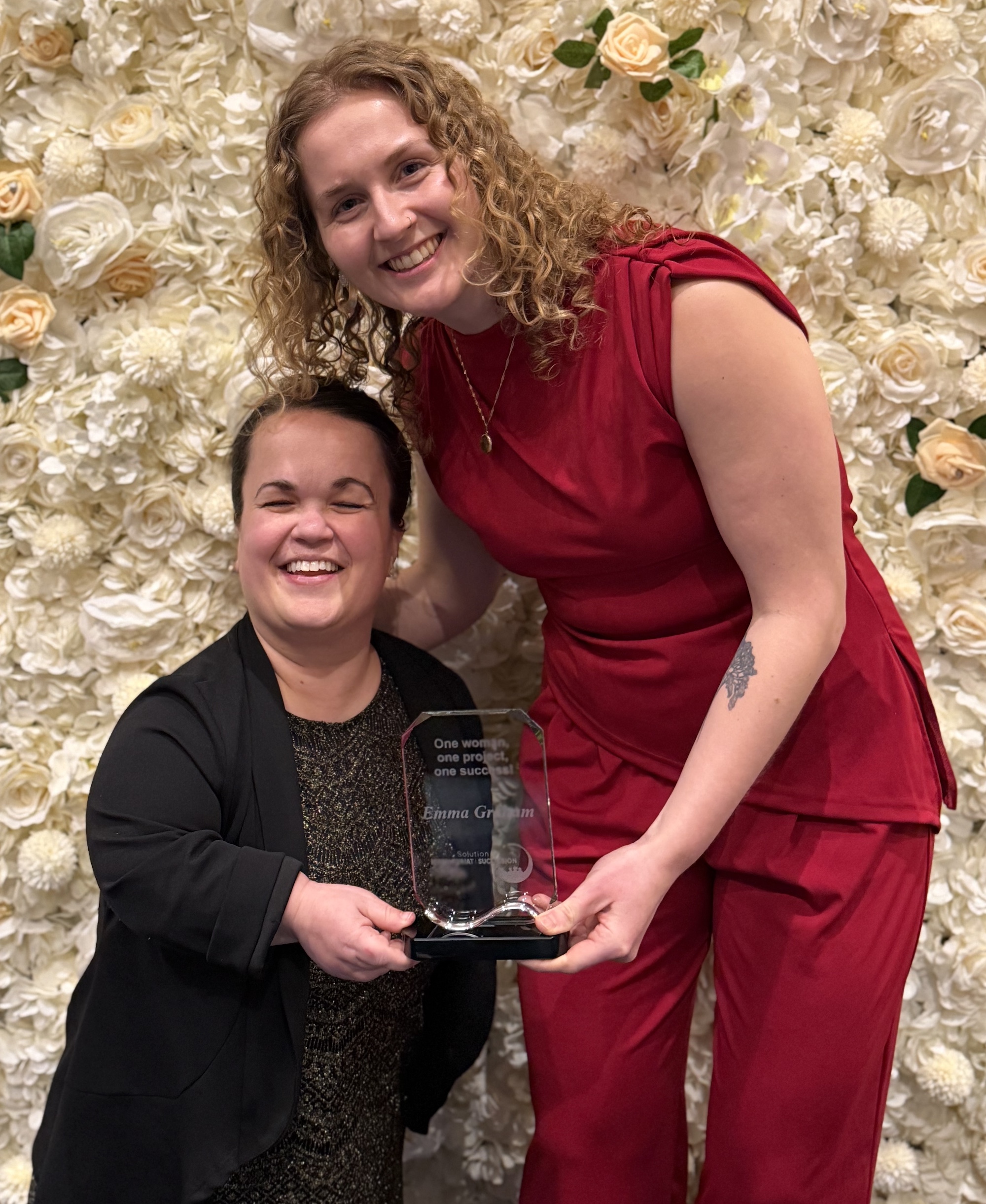 PHOTO 6 : Pour le volet anglophone du Nouveau-Brunswick, on aperçoit la chargée de projet Isabelle Arseneau, à la gauche, qui remet la plaque à la récipiendaire Emma Graham.