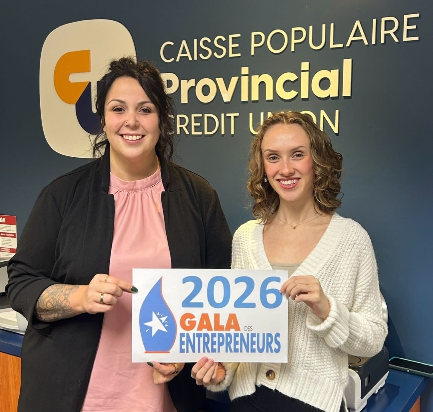 WELLINGTON – le 23 février 2026 – La Caisse populaire Provincial, représentée par la directrice de sa succursale Évangéline, Jessica Gallant (à la gauche), s’est fait un plaisir de confirmer qu’elle sera de retour comme commanditaire du niveau Or du Gala des entrepreneurs, édition 2026.