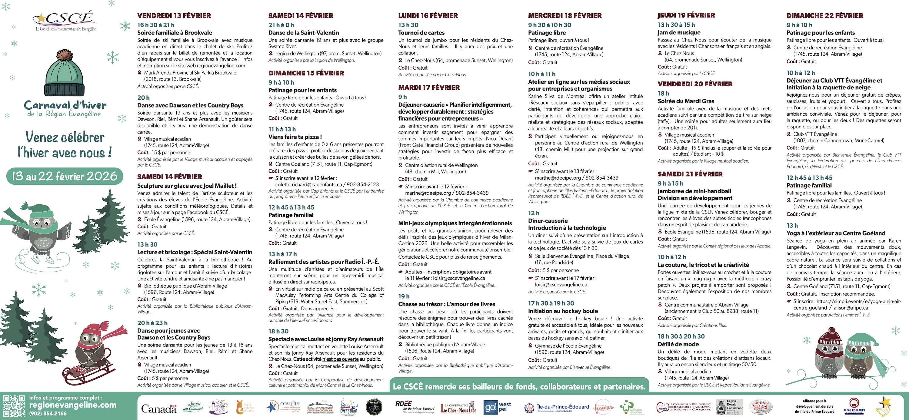 Alternativement, vous pouvez visiter le site web du Conseil scolaire-communautaire pour voir plus de détails sur chaque activité : https://www.regionevangeline.com/carnaval-dhiver/