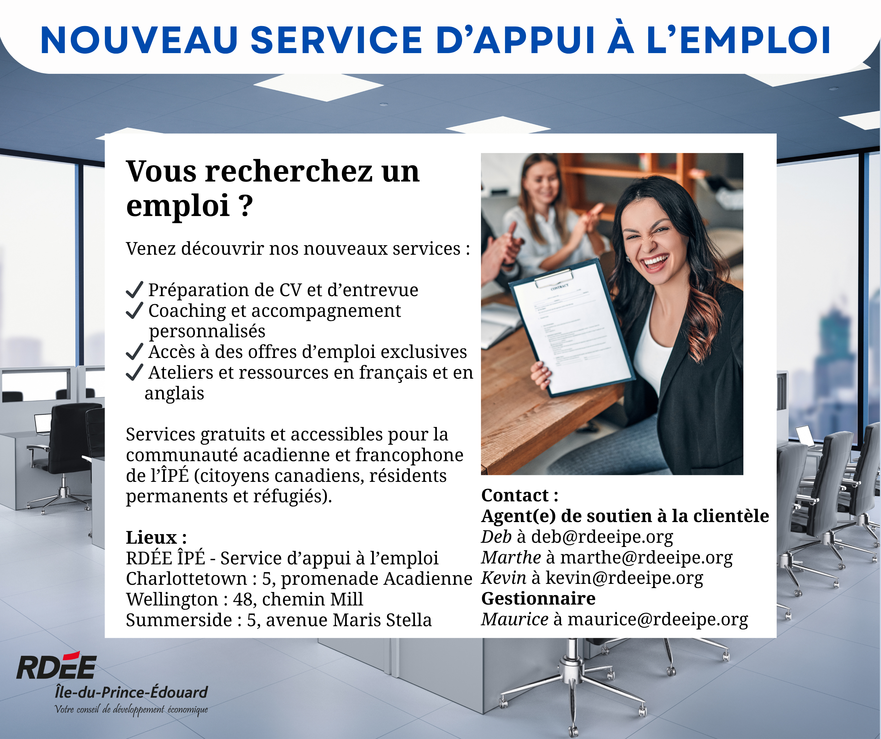 Venez découvrir nos nouveaux services d’appui à l’emploi, gratuits et accessibles pour la communauté acadienne et francophone de l’ÎPÉ (citoyens canadiens, résidents permanents et réfugiés) :