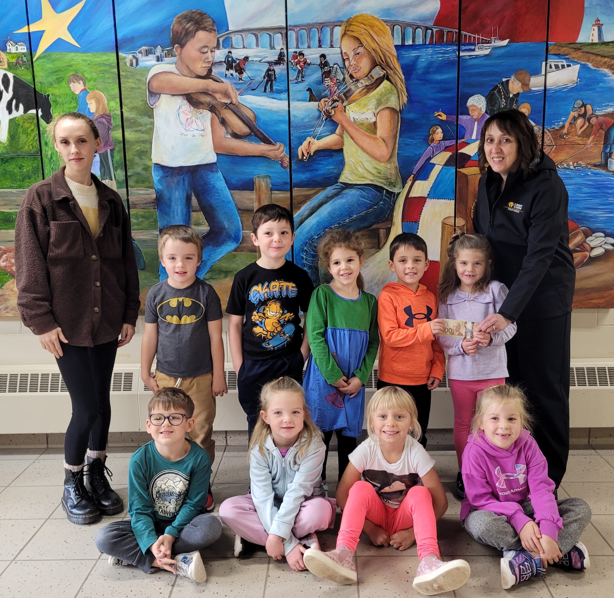 PHOTO 3: Lucy Ryan’s kindergarten class at Évangéline School won the $100 prize from the Provincial Credit Union (Évangéline branch) for collecting the most food items per student. On the far right of the photo is Alecia Arsenault of the Acadian and Francophone Chamber of Commerce of PEI, who came to help present the prize on Oct. 29, and on the left, Diane McInnis of Provincial Credit Union, who is presenting the $100 bill to the kindergarteners.