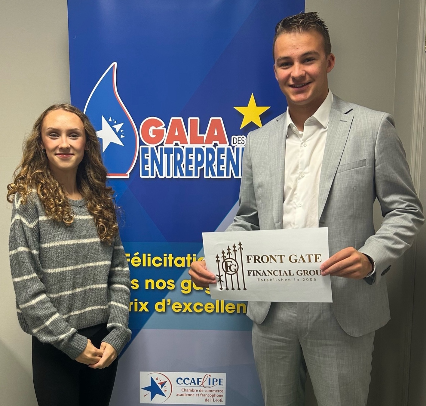 MONT-CARMEL – March 5, 2026 – Front Gate Financial Group will be back for a third year as a Gold-level sponsor of the Acadian Entrepreneurs’ Gala hosted by the Acadian and Francophone Chamber of Commerce of PEI. Nico Durant, investment and insurance broker at Front Gate, will co-sponsor the Young Millionaires Award category. This is quite fitting, as he is a former recipient of several Young Millionaires Awards himself. During the March 21 gala at the Village musical acadien in Abram-Village, Durant will present an award to either Danica Paynter of Danica’s Creations, Samantha Consejo Cadena of Samantha’s Tickle Trunk, or the brother and sister duo Mark and Lutchina Nakhleh of M&L Company. Gala coordinator Alecia Arsenault recently met with Durant to discuss his sponsorship. They remind everyone that Gala tickets, priced at $50 each (tax included), are on sale until March 13 in person at the Wellington Rural Action Centre, by email at marthe@rdeeipe.org, or by phone at 902-854-3439.