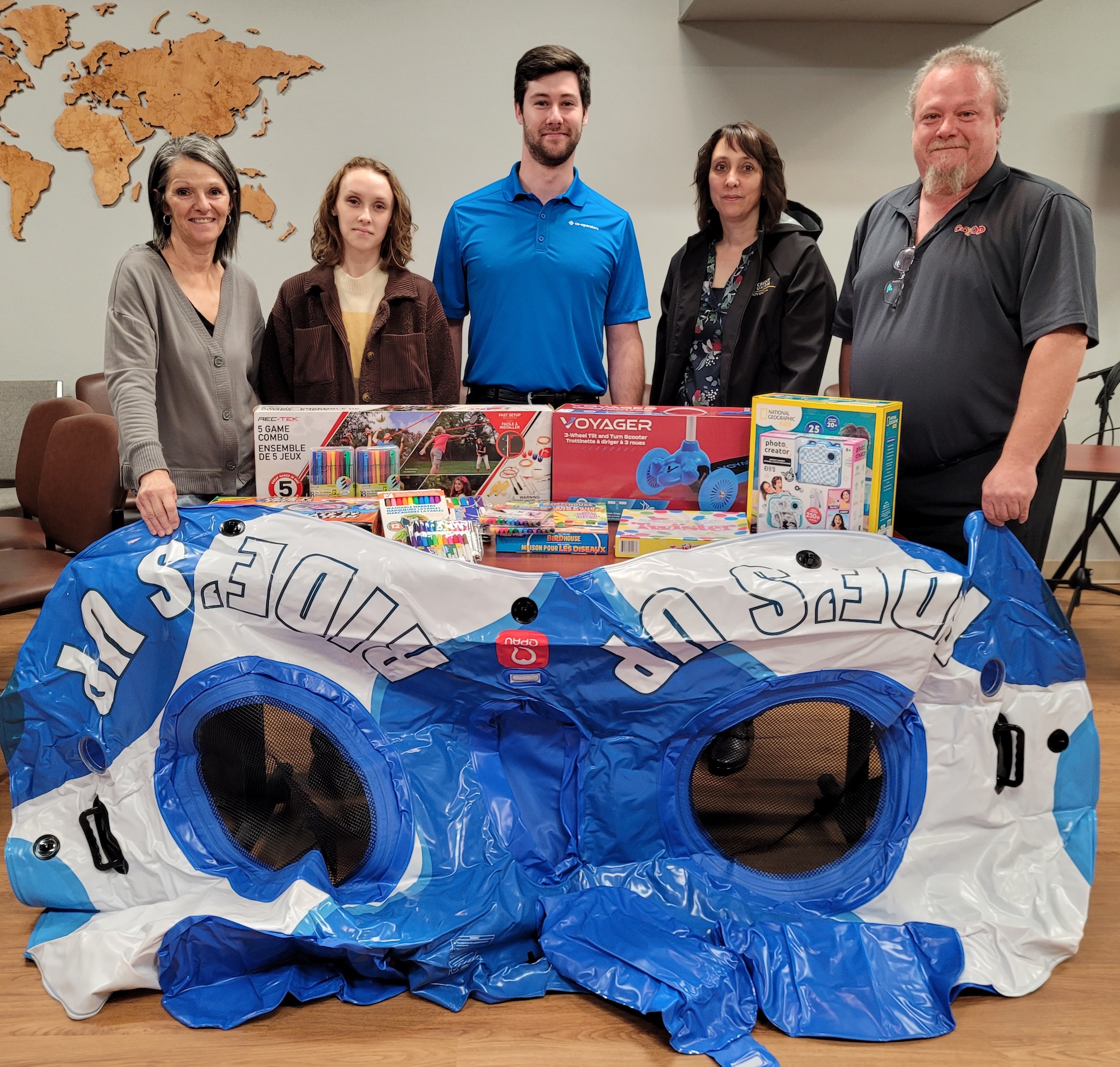 PHOTO: Showcasing the 23 prizes that were up for grabs in the “My Favorite Business or Co-op” drawing contest are the sponsors and organizers: from left, Annette Richard of le Conseil scolaire-communautaire Évangéline, Alecia Arsenault of the Acadian and Francophone Chamber of Commerce of PEI, Brendan Shea of MacDonald Insurance and Investments (The Co-operators), Diane McInnis of Provincial Credit Union, and Chris O’Brien of the Wellington Co-op.
